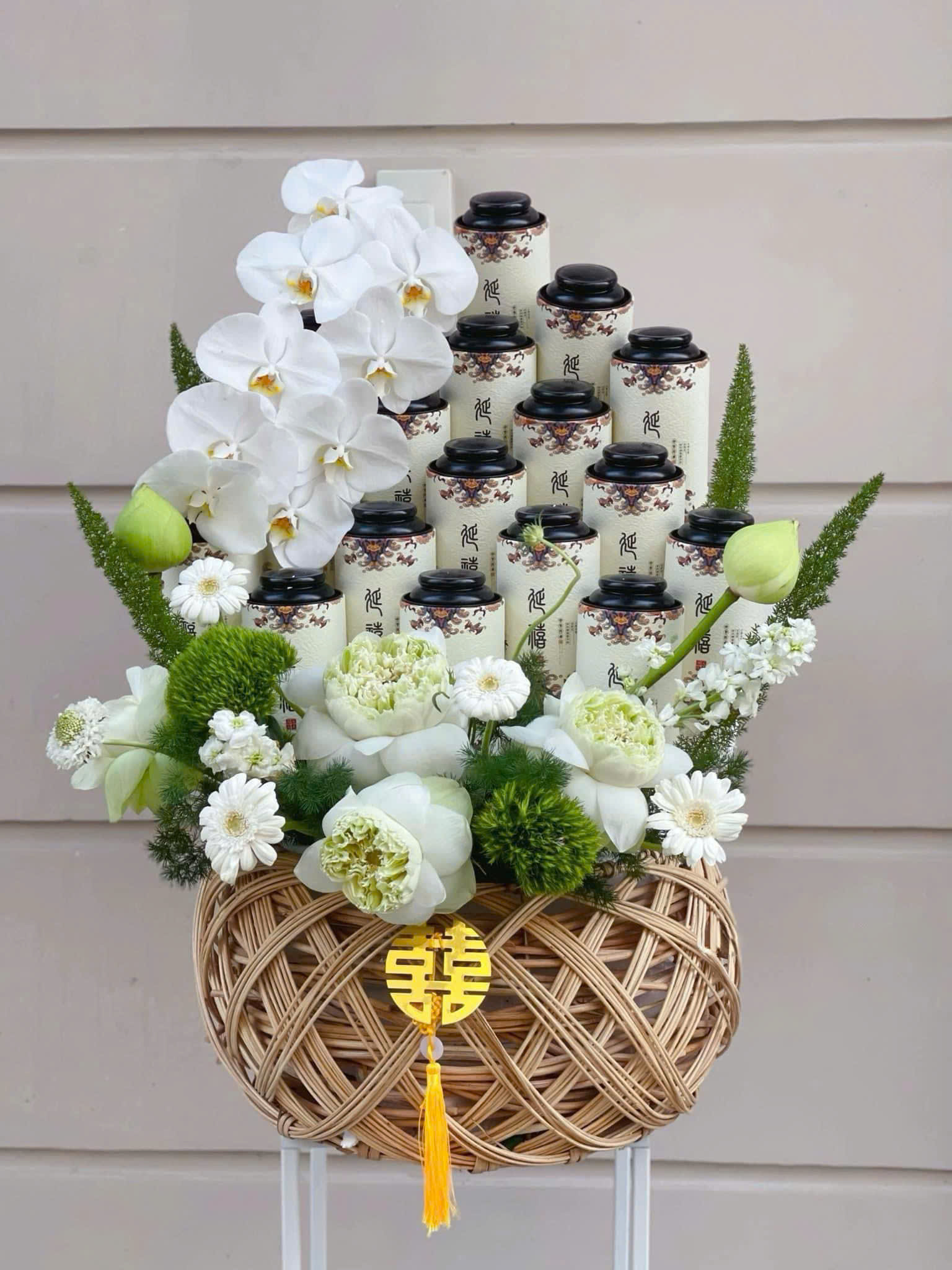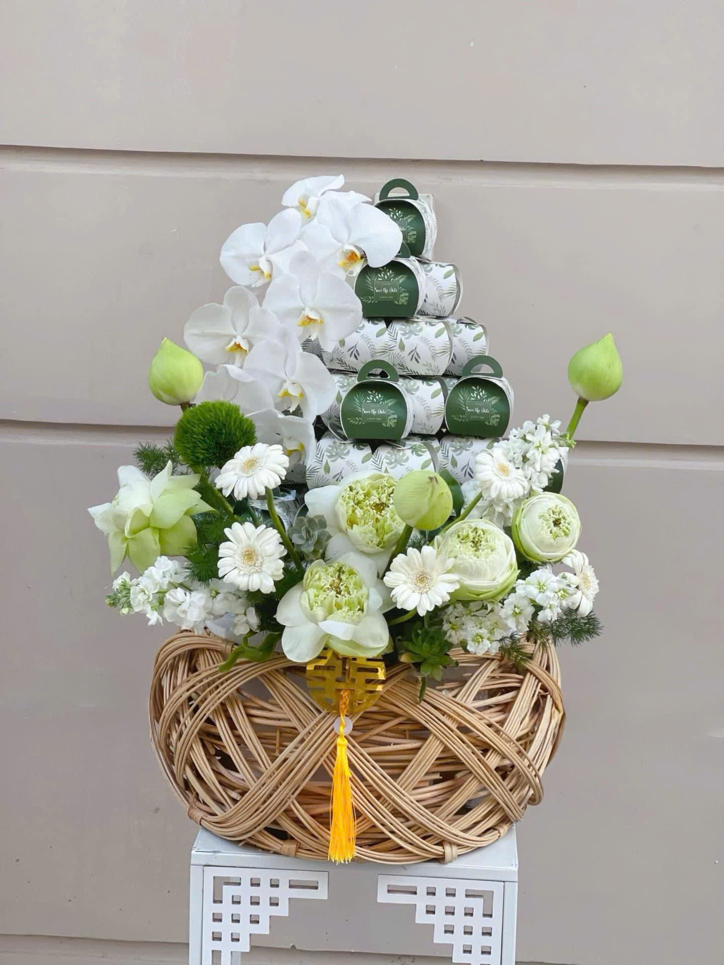 Mâm quả Cưới tông trắng Xanh phối mâm tre sang trọng