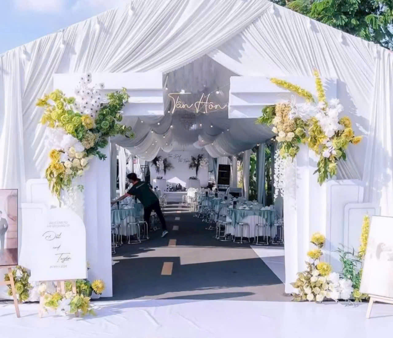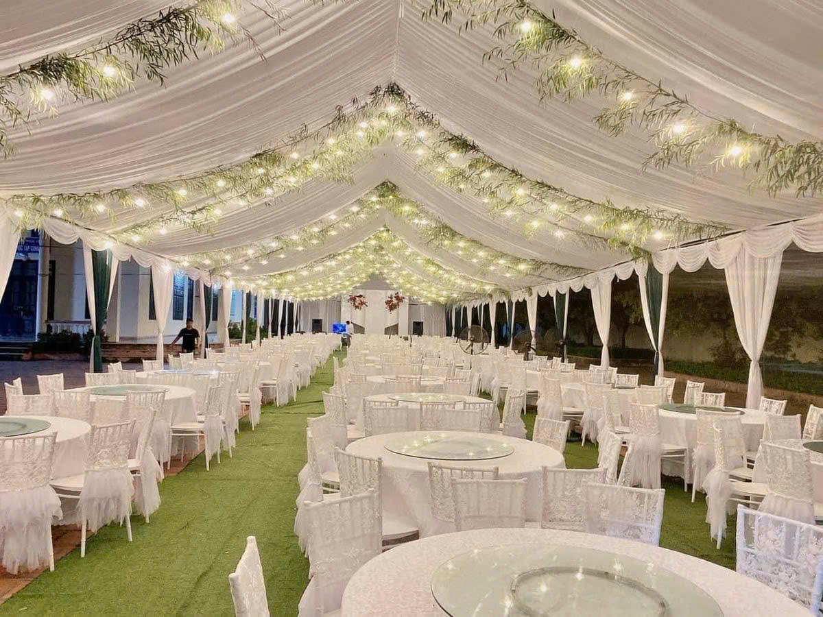 Rạp cưới tông trắng phối trang trí lá xanh cao cấp hiện đại